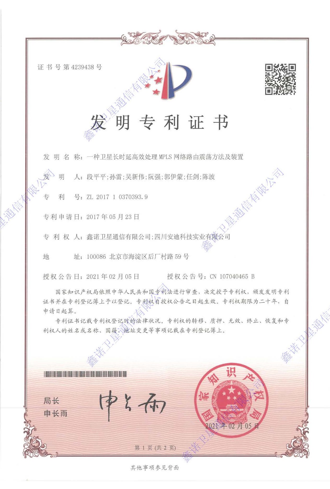 2021年2月5日,鑫諾公司聯合研發的“一種衛星長時延高效處理MPLS網絡路由震蕩方法及裝置”喜獲國家發明專利。本專利是鑫諾公司在承接航天科技創新研發項目的基礎上提煉、衍生的技術成果,是鑫諾公司開展應用需求、創新課題、合作開發、技術成果與推廣系統化創新探索的成效體現。